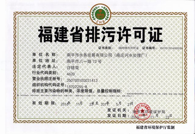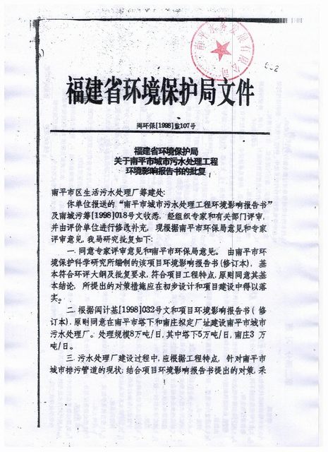 南莊污水處理廠已完成環(huán)!叭瑫r”, 于2011年6月通過福建省環(huán)境監(jiān)測站建設(shè)項目竣工環(huán)境保護(hù)驗收。