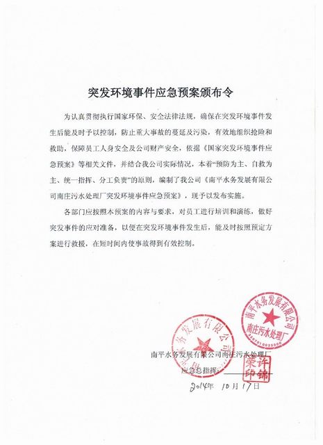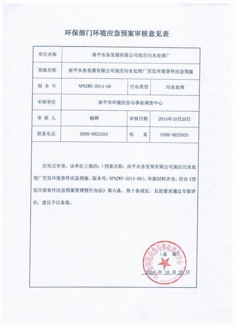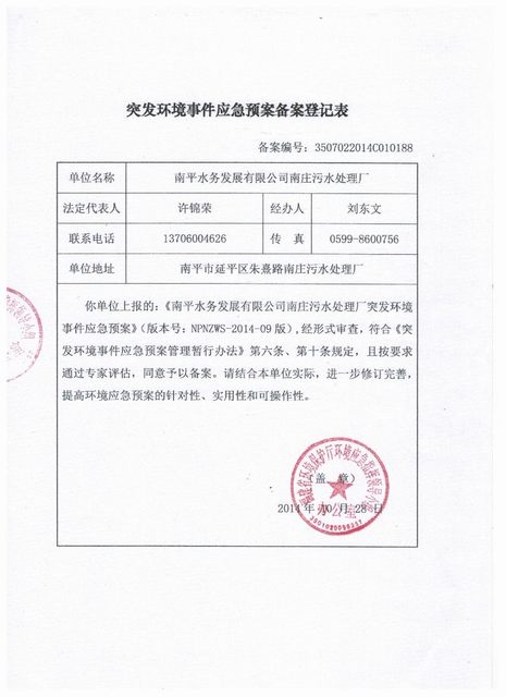 公司針對南莊污水處理廠的環(huán)境風(fēng)險源修訂了突發(fā)環(huán)境事件,設(shè)置了環(huán)境風(fēng)險防范措施及應(yīng)對手段,編制了《南平水務(wù)發(fā)展有限公司南莊污水處理廠突發(fā)環(huán)境事件應(yīng)急預(yù)案》經(jīng)過專家評審,于2014年在環(huán)保部門備案,同時每年按例進(jìn)行應(yīng)急演練。