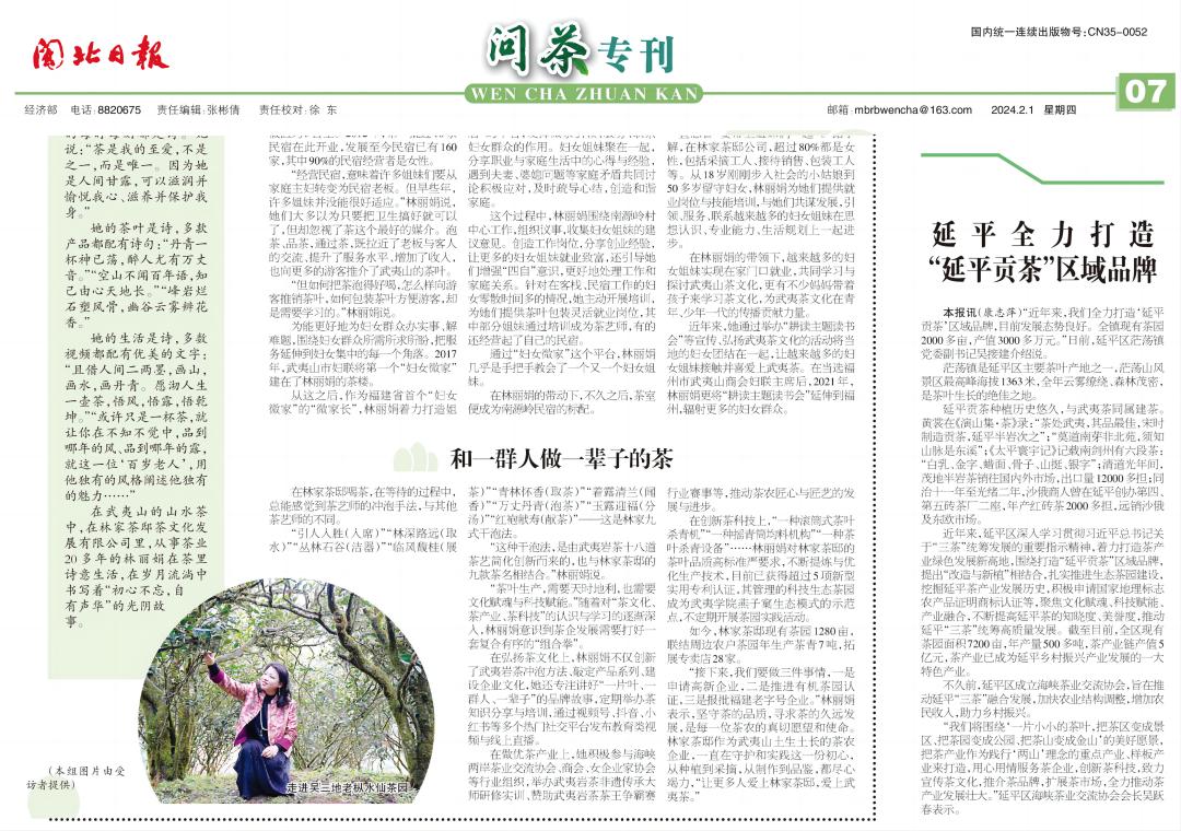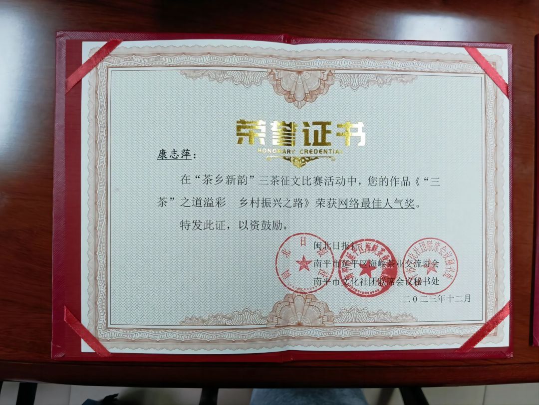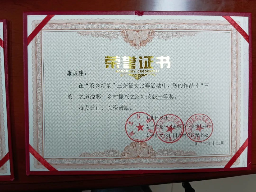 南平水務(wù)發(fā)展有限公司第二支部書記康志萍通過深入調(diào)查研究,撰寫《“三茶”之道溢彩、鄉(xiāng)村振興之路》參加征文比賽,以獨(dú)特的視角和文筆生動地描繪了閩北地區(qū)的三茶文化,講述茶文化新故事,謳歌茶產(chǎn)業(yè)新變化,描繪茶科技新圖景。獲得一等獎(jiǎng)和網(wǎng)絡(luò)最佳人氣獎(jiǎng);展現(xiàn)了延平貢茶豐富內(nèi)涵和鄉(xiāng)村振興深遠(yuǎn)影響,在《閩北日報(bào)》副刊上刊發(fā)。促進(jìn)三茶文化的傳播和發(fā)展,為閩北地區(qū)的鄉(xiāng)村振興繁榮做出貢獻(xiàn)。