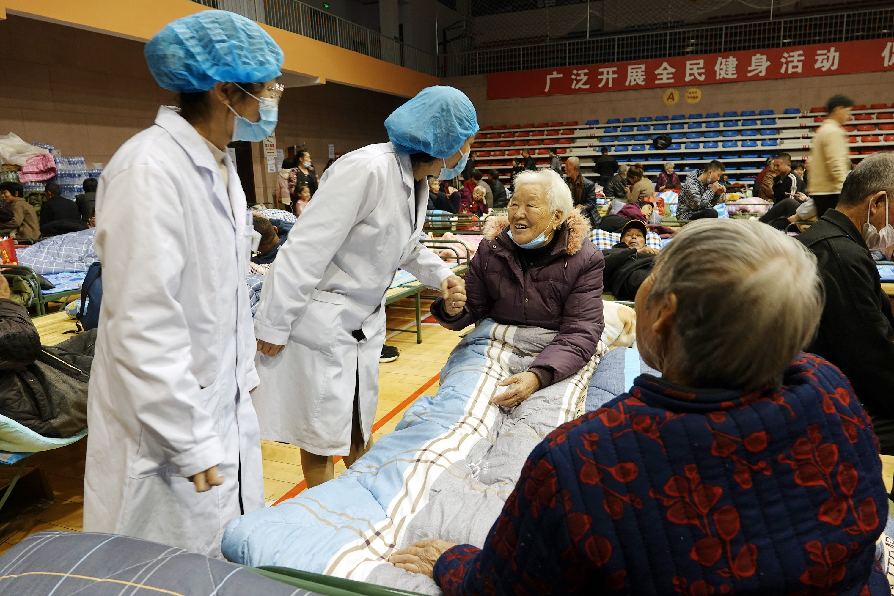 10月8日,在運城市新絳縣體育館安置點,兩名值守醫(yī)護人員(左)了解洪峰受災群眾身體健康情況。高新生攝