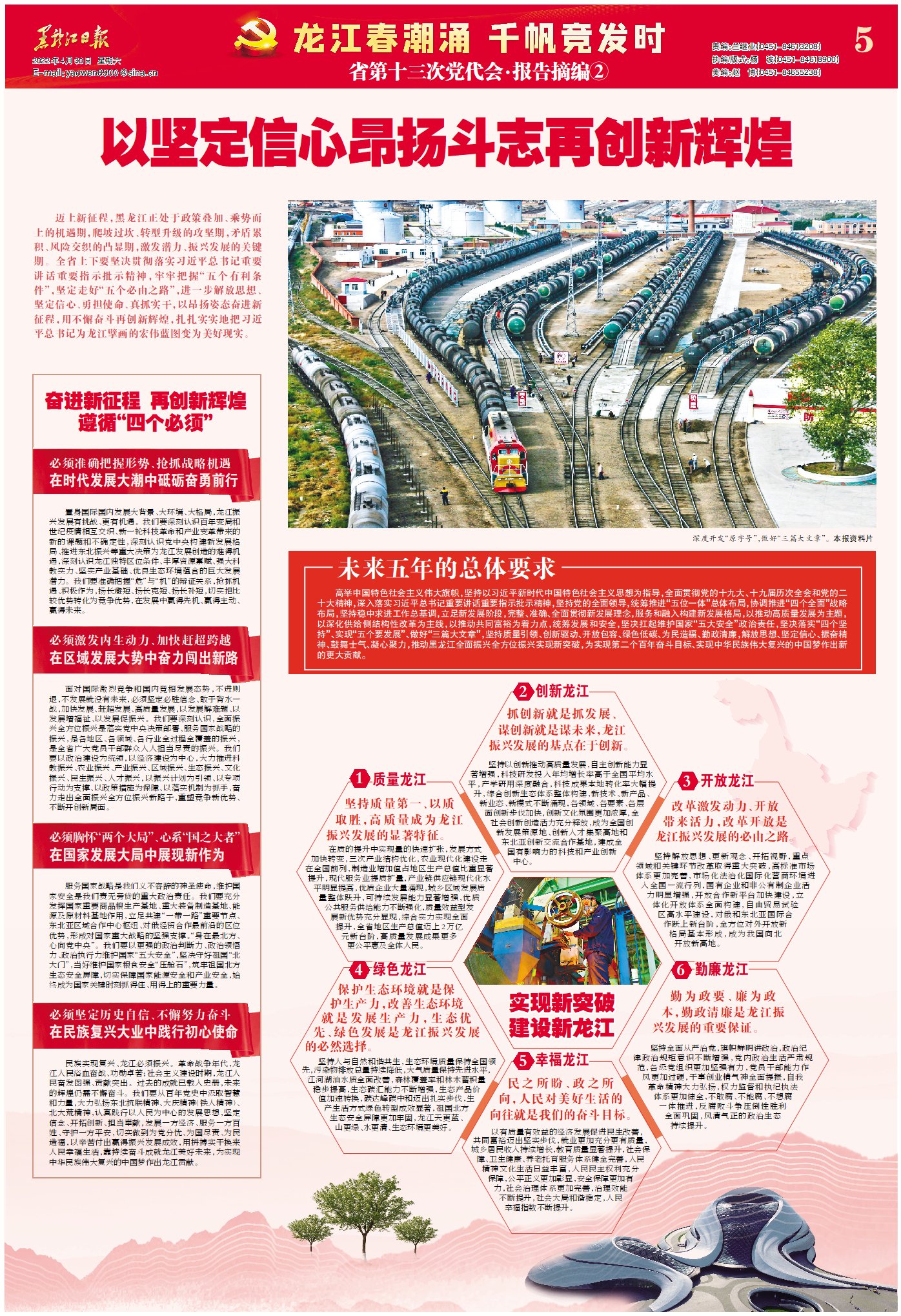 高舉中國特色社會主義偉大旗幟,堅持以習(xí)近平新時代中國特色社會主義思想為指導(dǎo),全面貫徹黨的十九大、十九屆歷次全會和黨的二十大精神,深入落實習(xí)近平總書記重要講話重要指示批示精神,堅持黨的全面領(lǐng)導(dǎo),統(tǒng)籌推進(jìn)“五位一體”總體布局,協(xié)調(diào)推進(jìn)“四個全面”戰(zhàn)略布局,堅持穩(wěn)中求進(jìn)工作總基調(diào),立足新發(fā)展階段,完整、準(zhǔn)確、全面貫徹新發(fā)展理念,服務(wù)和融入構(gòu)建新發(fā)展格局,以推動高質(zhì)量發(fā)展為主題,以深化供給側(cè)結(jié)構(gòu)性改革為主線,以推動共同富裕為著力點,統(tǒng)籌發(fā)展和安全,堅決扛起維護(hù)國家“五大安全”政治責(zé)任,堅決落實“四個堅持”、實現(xiàn)“五個要發(fā)展”、做好“三篇大文章”,堅持質(zhì)量引領(lǐng)、創(chuàng)新驅(qū)動、開放包容、綠色低碳、為民造福、勤政清廉,解放思想、堅定信心、振奮精神、鼓舞士氣、凝心聚力,推動黑龍江全面振興全方位振興實現(xiàn)新突破,為實現(xiàn)第二個百年奮斗目標(biāo)、實現(xiàn)中華民族偉大復(fù)興的中國夢作出新的更大貢獻(xiàn)。